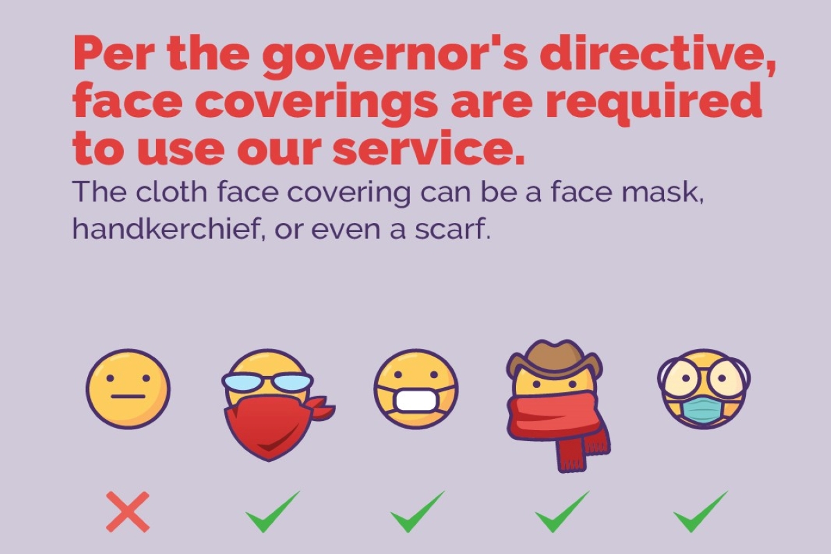 In case you missed the governor’s announcement yesterday, face coverings are now mandatory while in public spaces which includes public transit. While we’ve been suggesting that our transit customers wear face coverings, it will now be required, upon boarding and throughout the duration of the ride. This change takes effect tomorrow, Friday June 26. Remember that face coverings can be a mask, handkerchief, or even a scarf.