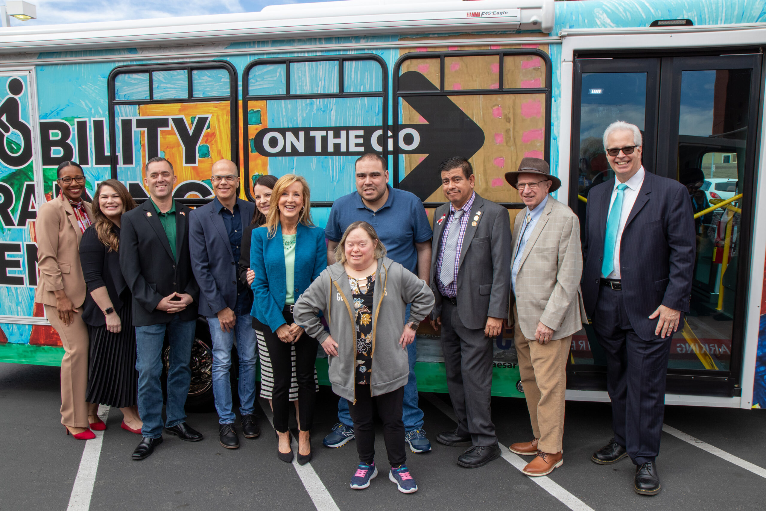 Las Vegas, NV (Feb. 29. 2024) — Today, the Regional Transportation Commission of Southern Nevada (RTC), in partnership with Opportunity Village (OV), launched the agency’s Mobility Training Center on the GO. This specially retrofitted RTC bus serves as a mobility training lab to help vulnerable populations and those with disabilities navigate the RTC transit system confidently. Artwork created by commissioned artists from the Boyd Gaming Fine & Performing Arts Program at Opportunity Village was unveiled during the event. Caesar G., Sharen G. and Kelly G. were recognized for their work, which is displayed on the vehicle, at bus stops and on buses.