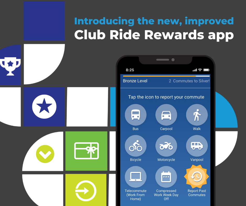 The Club Ride Rewards app is an easy way to report when you carpool, vanpool, ride public transit, walk, motorcycle, bike, work from home, and compressed work week day off.