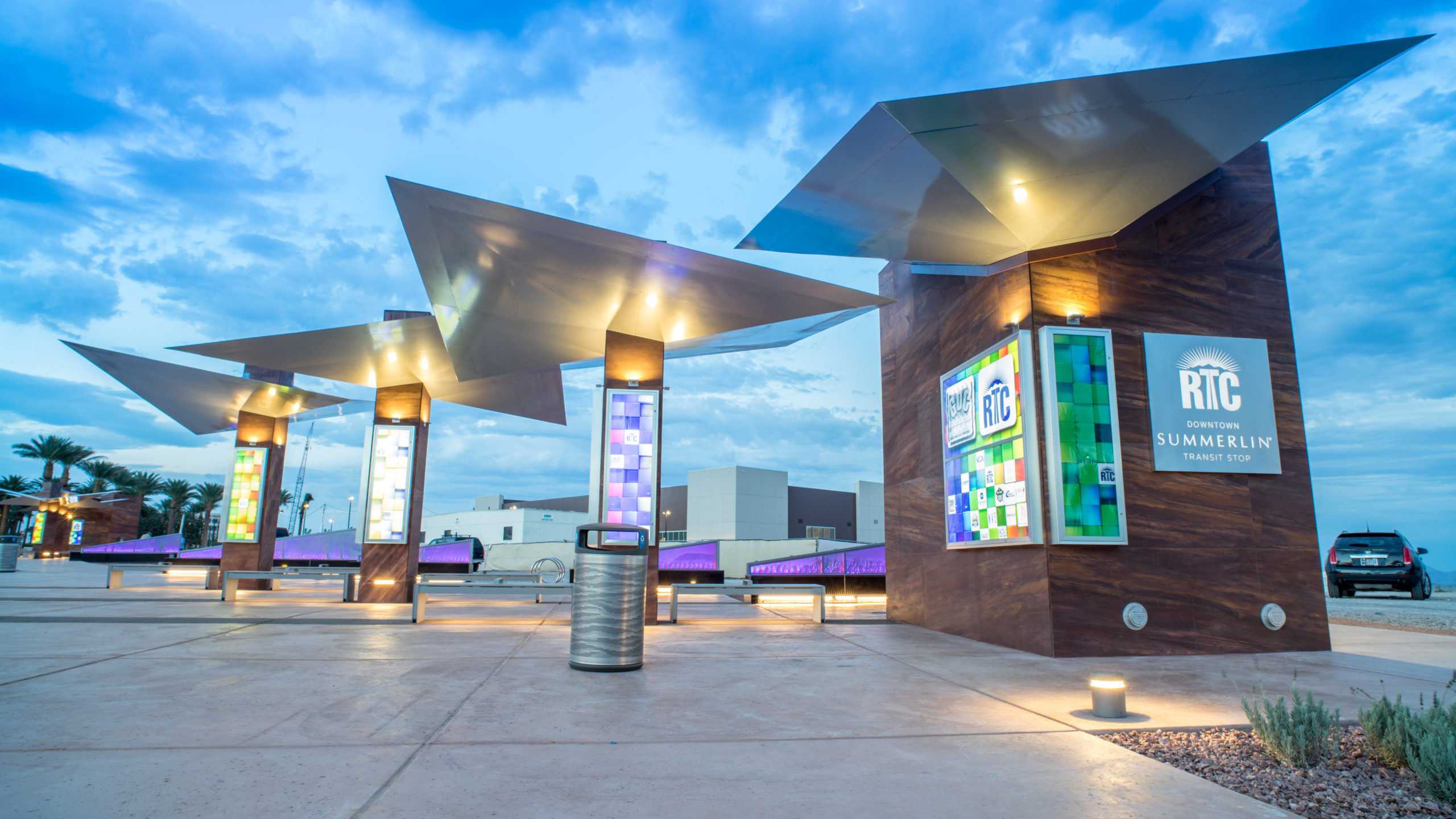 Located in front of the Las Vegas Ballpark and near the Vegas Golden Knights practice facility across from Downtown Summerlin at Pavilion Center Dr. and Summerlin Centre Dr., the Downtown Summerlin Transit Facility features an open plaza, shaded canopies, benches, bicycle racks and landscaping. Route 206 (Charleston) and the Sahara Express (SX) service the stop and operate 24 hours a day, 7 days a week.